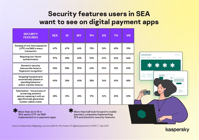 OTPs are the top priority for consumers in most Southeast Asian countries like Indonesia (67 per cent), Malaysia (66 per cent), the Philippines (75 per cent), Thailand (63 per cent), and Việt Nam (74 per cent) though in Singapore two-factor authentication is the most urgent concern (65 per cent).