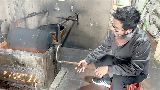 | Nguyễn Đức Hiếu enthuses with his special coffee bean roasting on a firewood oven. VNS Photo Lê Hương |