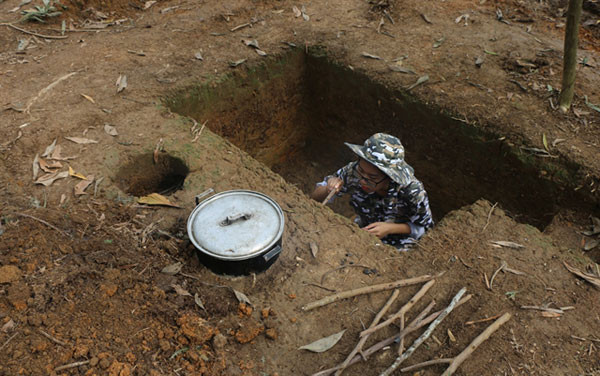 Cam didn't give up. He dug dozens more, doubling the tunnel lengths and adding more turns. He would place tree branches on the tunnels and then cover them with dirt so no visible smoke could come out. He also dug a large hole in front of the stove, covered with a plastic mat, where he could store cooking tools on top, and cover the light. Underneath, the hole was like a smoke cell, giving more air for the fire to burn stronger.