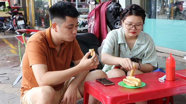 Nguyen Tuong Quan, a visitor from Nghe An, with his girlfriend also enjoy eating this modest banh mi.