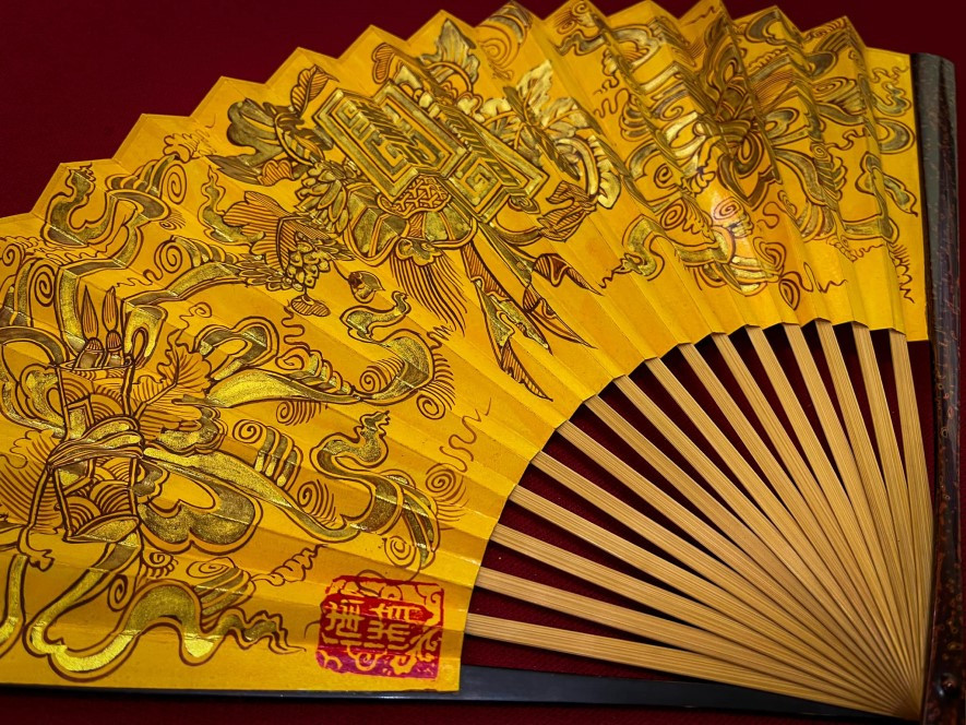 Hanoi-based artist Nam Chi (1996) gently applied his brush, outlining the silvery paint on the cloud pattern of the Dragon and Fairy fan. On the yellow paper background, traditional patterns shine, showing the shape of a handmade product in the making, both known and strange.