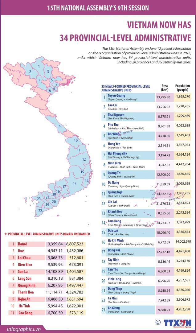 The Government submitted, and the National Assembly passed Resolution No. 202/2025/QH15 on June 12, 2025, regarding the reorganisation of provincial-level administrative units. At the same time, the National Assembly Standing Committee issued 34 resolutions on the reorganisation of commune-level administrative units in 34 newly-formed provinces and centrally-run cities.