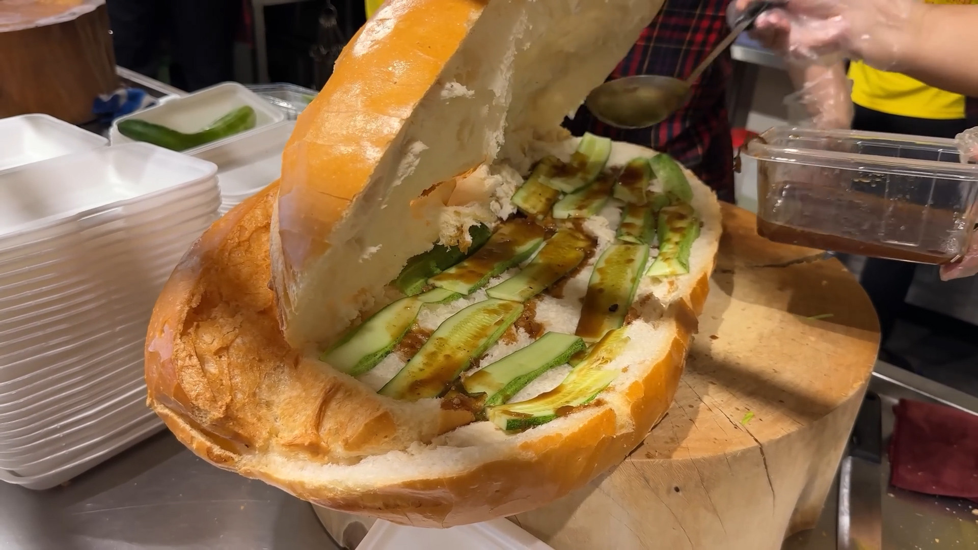 Max's curiosity drove him to enhance the sandwich further by adding 1kg each of roast pork, roast duck, and offal. The task of assembling this gastronomic giant required the assistance of three restaurant employees, who meticulously layered cucumber, special meat sauce, roasted meats, onions, and chili within the immense loaf.