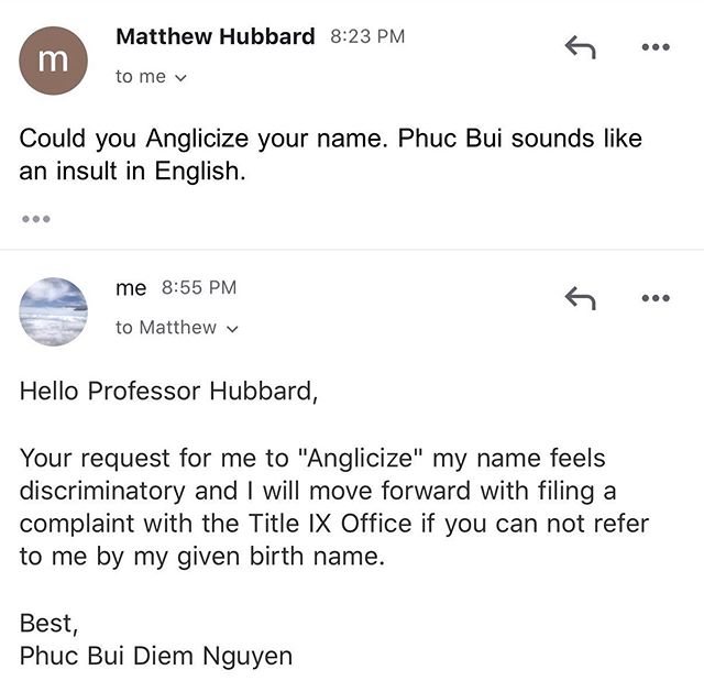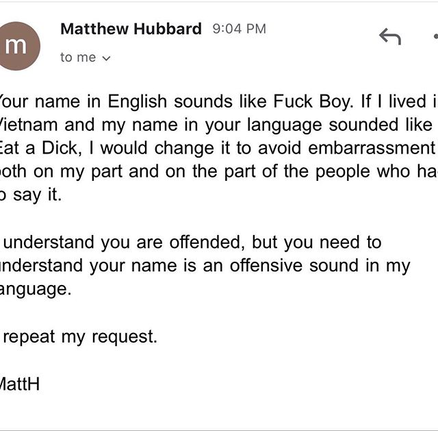 “Your name in English sounds like Fuck Boy. If I lived in Vietnam and my name sounded like Eat a Dick, I would change it to avoid embarrassment both on my part and on the part of the people who had to say it. I understand you are offended, but you need to understand your name is an offensive sound in my language. I repeat my request,” he replied.