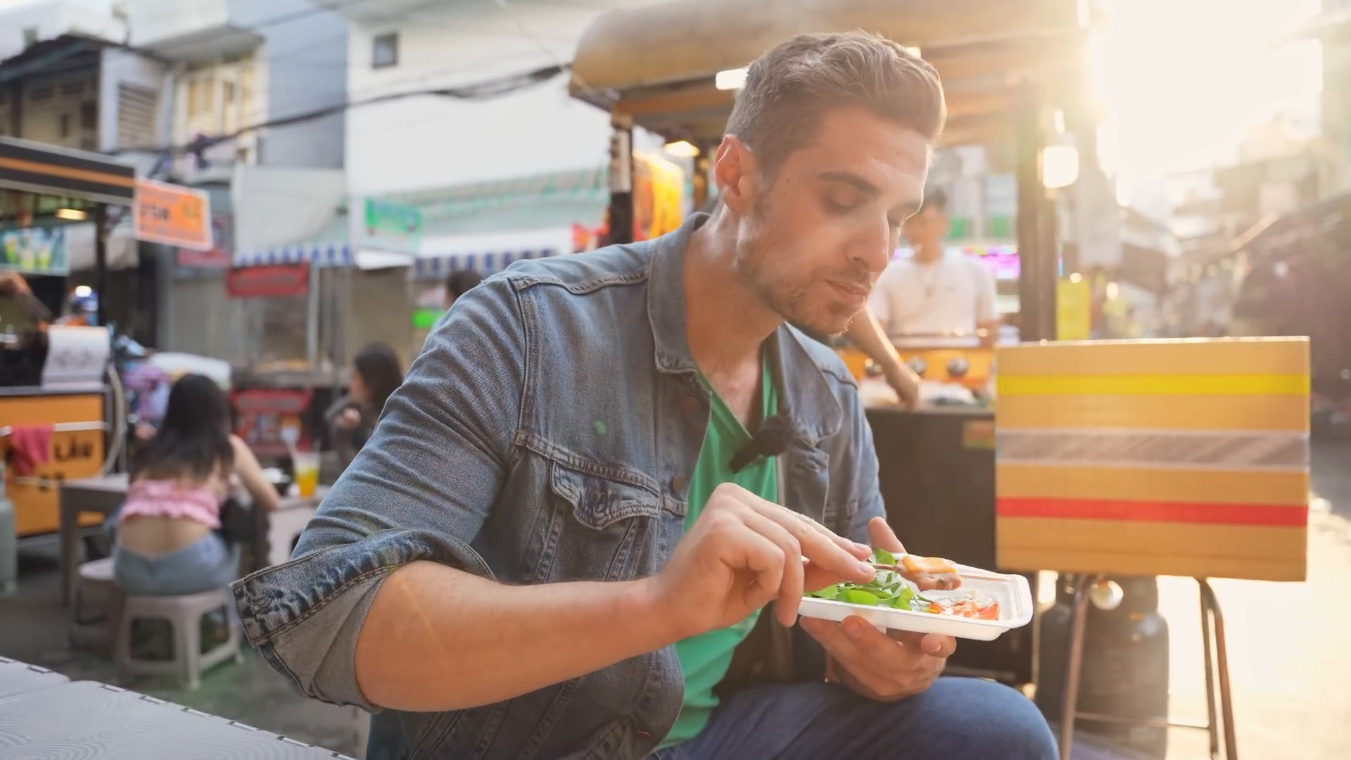 As dusk fell, Ho Thi Ky market had more vendors. Dustin then went to search for his favorite food - rice paper salad. He was surprised when a portion cost 30,000 VND, while he usually gets it for 10,000 - 15,000 VND. "There could be more side dishes here. It's a little over the $1 mark, but I'm craving it," Dustin said.