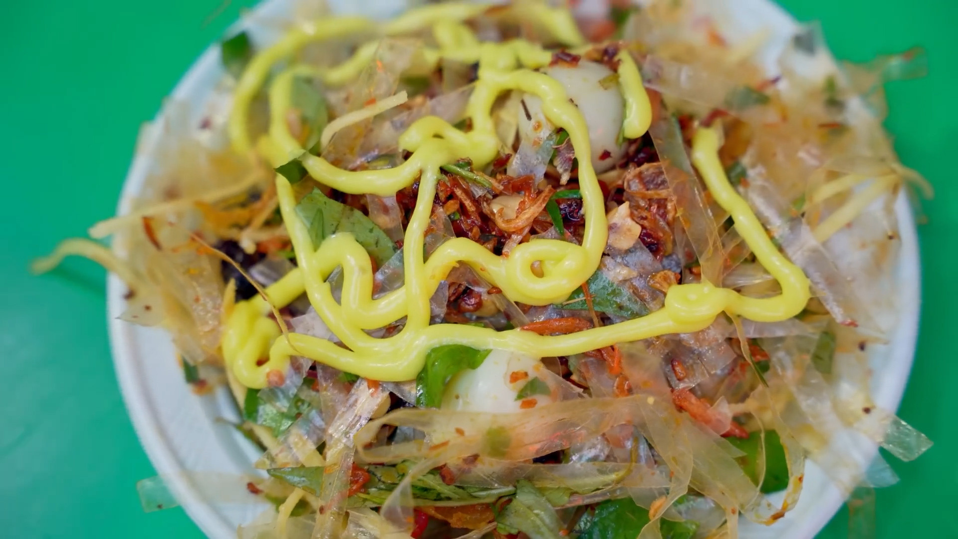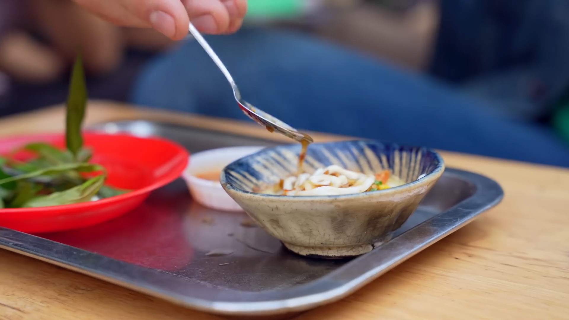 It includes the main ingredients of rice paper, quail eggs and dried meat. Dustin added sauce and chili. "Delicious! The rice paper here is a bit fattier than usual, maybe they use more butter. There is also beef jerky here.".