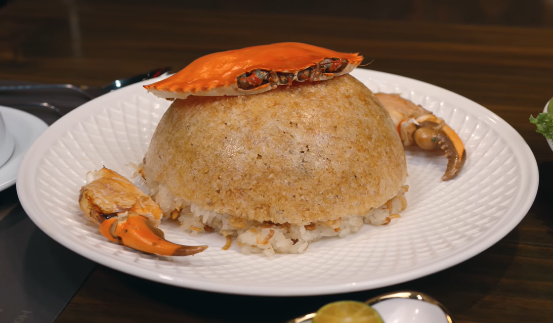 The sticky rice is then pressed into a metal bowl and deep-fried to create a crispy, golden crust. Once fried, it is filled with the crab mixture and delicately flipped over, forming a giant, crab-shaped serving with its shell and claws as decoration.