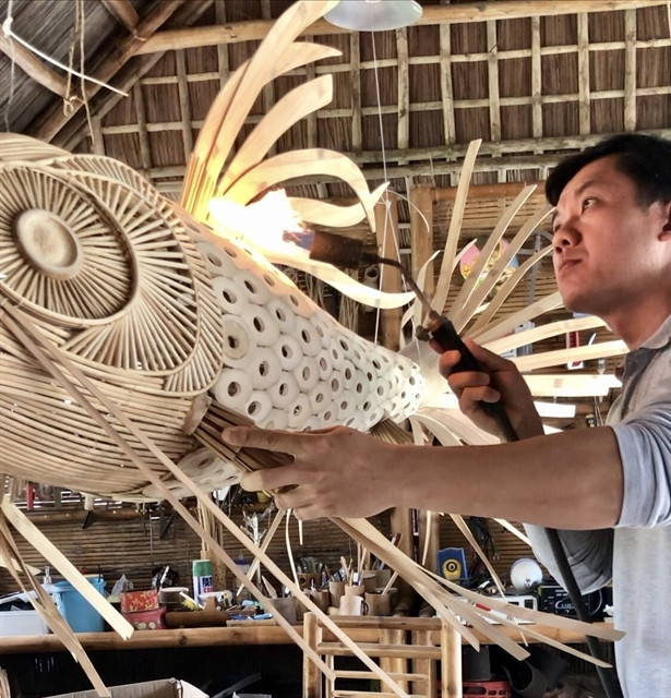 | LOCAL CRAFTS: Võ Tấn Tân, a craftsman is making a bamboo Koi fish at a workshop in Cẩm Thanh Commune of Hội An. Photo courtesy of Taboo Bamboo |