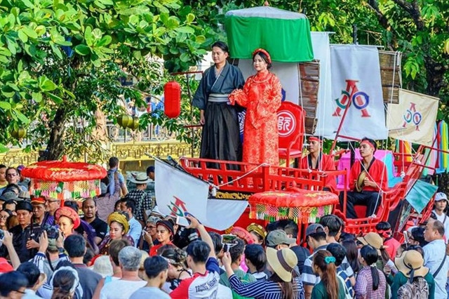 | A reenactment of the 17th-century wedding procession held for Vietnamese Princess Ngọc Hoa and Japanese businessman Araki Sotaro takes place in the Old Quarter of Hội An during the Hội An-Japan Cultural Exchange Day. Photo courtesy of Hội An City's Information & Sports Centre |