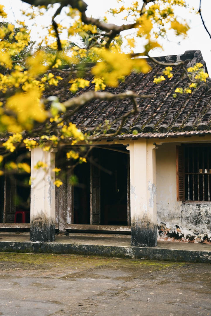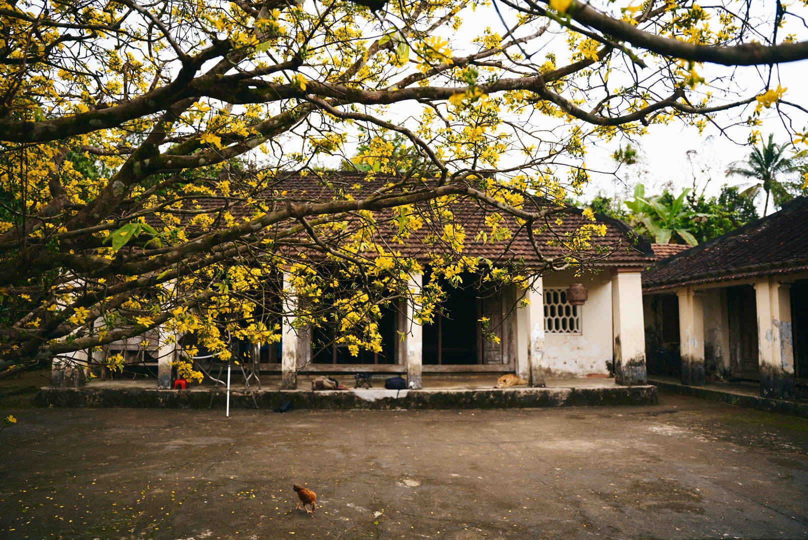 Located in Loc Yen ancient village, Quang Nam, the tree’s vibrant blossoms contrast beautifully against the moss-covered home, evoking a deep sense of nostalgia and admiration.