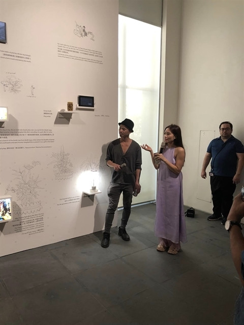 | Artist Tuấn Mami (left) introduces his works at the exhibition opening ceremony. — Photo courtesy of the artist |