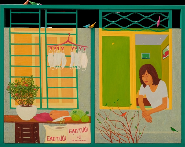 This series is divided into two parts for display. Part one consists of four artworks created during the period when Việt Nam underwent two major lockdowns due to COVID-19, aiming to illustrate the artist's inner perspectives during that time. The second part includes six artworks, most inspired by the proverb "fish in a pot, bird in a cage," using symbols like an empty cage with a bird, a fish touching the moon representing freedom, and objects such as vases and a dress, prompting thoughts about life and the role of people, particularly East Asian women, in the modern world.