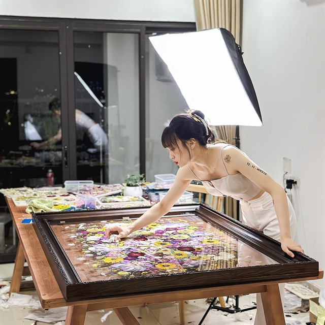 | Nguyễn Thị Thu Thủy is seen at work, arranging assorted dried flowers in frames. — Photo courtesy of Thủy |