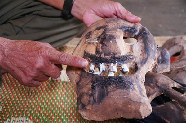 A Yứk can carve three masks a day on average. After shaping, the final step is to heat the masks with fire to create a strange, eye-catching look.