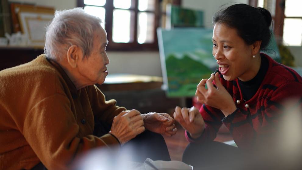 Le Thi being tended to by her granddaughter who brings Le Thi her meals.