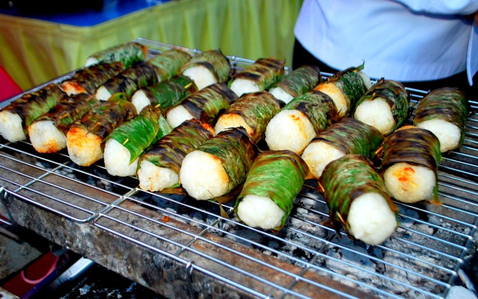When the bananas have just begun to ripen, the chef peels off the skin and dries the bananas under the sun twice. Thus, the bananas absorb the spices after grilling. Then, the banana is wrapped in sticky rice, which is cooked glutinous rice mixed with grated coconut meat.