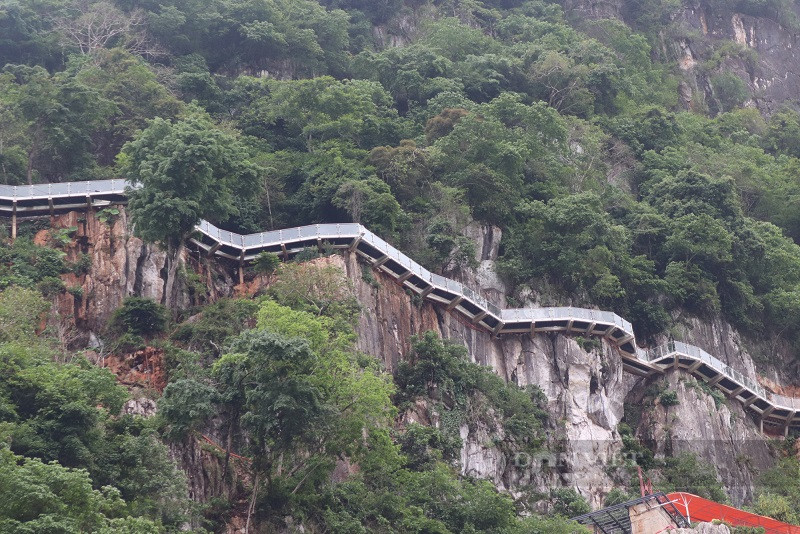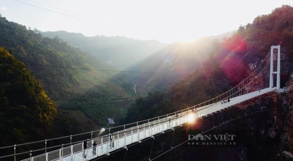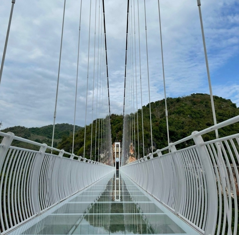 Measuring 2.4 metres in width and 632 metres in length, 290 metres of which crosses the mountain cliff while 342m bends along the mountain side, the newly inaugurated Bach Long Bridge looks like a winding white dragon embracing the mountains and forests of Muong Sang. Its floor is made from super tempered glass imported from France.