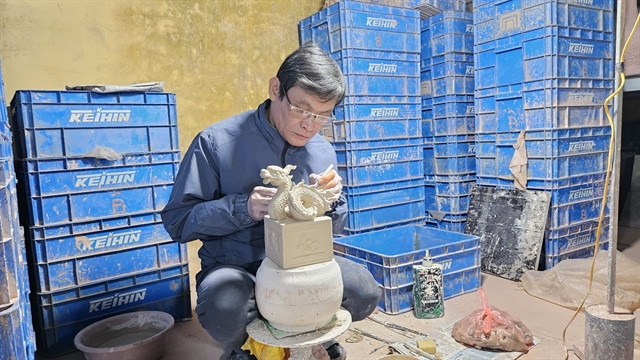 | Artisan Phạm Việt Khoa assemblies the dragon seal. |