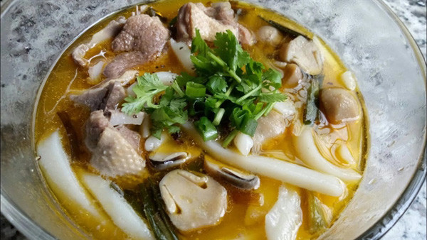 These include bánh canh with giò heo (pork leg), bánh canh with chicken, bánh canh with shrimp and coconut juice, and bánh canh with snakehead fish or sea crab, but the most popular is bánh canh with duck meat.
