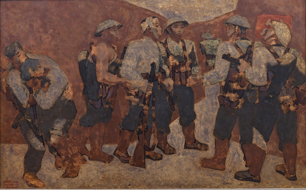 Party Admission Ceremony in Điện Biên Phủ Battlefield has a tight composition, strong shapes, and bold colours. The painting does not reveal too many techniques, but the bold contrast and ingenious colour transition have showcased a richness of colours and the artistic style of the leading artist of Vietnamese fine arts. It is an epic representation of the Vietnamese revolutionary spirit.