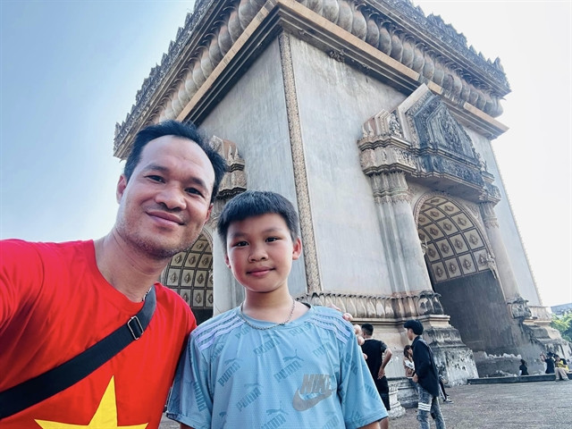 | Nông Quang Anh and his father check in at the Patuxai monument in Vientiane, Laos, during their 30-day trip. — Photo courtesy of Nông Quang Duy |