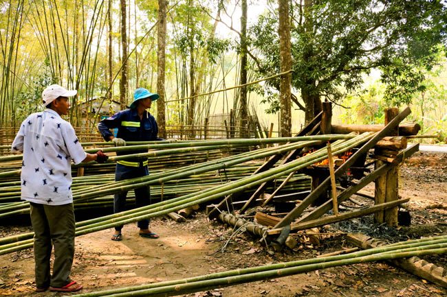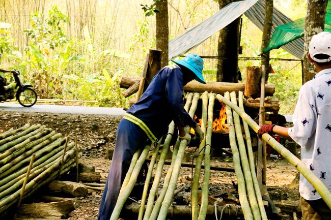After harvesting, nulgar bamboo trunks need to be straightened because in their habitats, the bamboos are bent because of their extreme length. At home, the trunks are parched for bending. It takes workers from two to three minutes to make a nulgar bamboo trunks become straight. Although the trade is a hard job, it helps locals lead a better life with daily income of VND200,000-300,000 (US$9-14) per person.