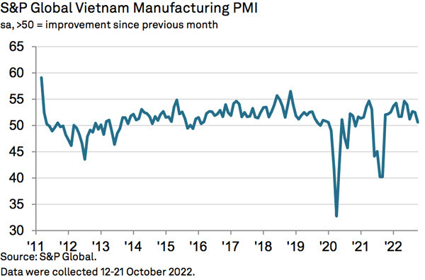 Business conditions in the Vietnamese manufacturing sector continued to improve with the S&P Global Vietnam Manufacturing Purchasing Managers’ Index (PMI) in October staying above the 50-mark at 50.6.
