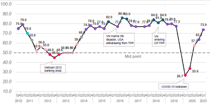 Business Climate Index (BCI) measuring sentiment of European enterprises in Vietnam hit 73.9 points in the first quarter of 2021, the highest score recorded since the third quarter of 2019, before the Covid-19 pandemic took toll on global trade and investment.