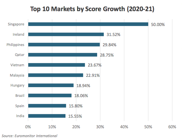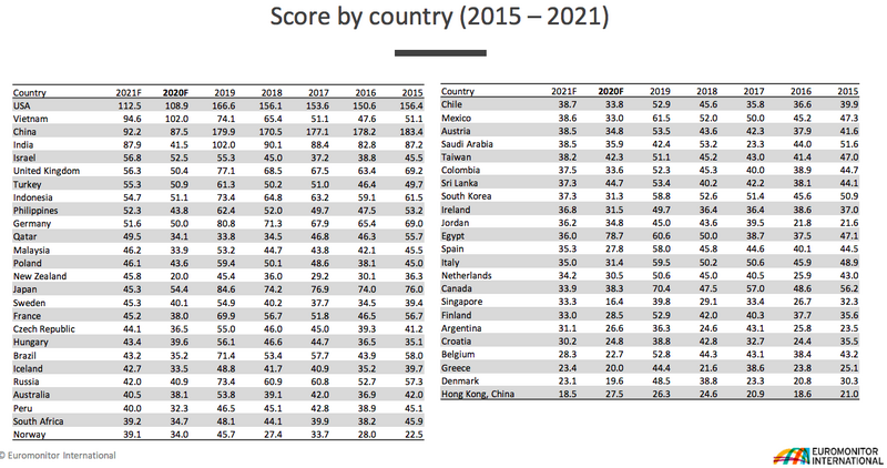 The country is set to score 102 and 94.6 out of the maximum of 250 in 2020 and 2021, staying behind only the US with its respective scores of 108.9 and 112.5. Other countries in Euromonitor’s top 5 included China, India and Israel.