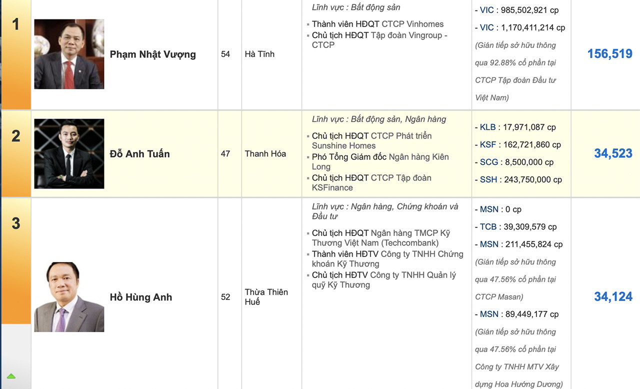 The owner of Techcombank, Ho Hung Anh, has VND34.124 trillion, followed by Hoa Phat president Tran Dinh Long, with VND33.966 trillion, and Nguyen Thi Phuong Thao from Vietjet Air with VND33.176 trillion.