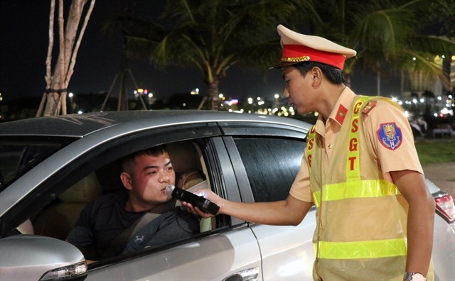 | A driver in Phú Yên being tested for alcohol levels. VNA/VNS Photo Xuân Triệu |
