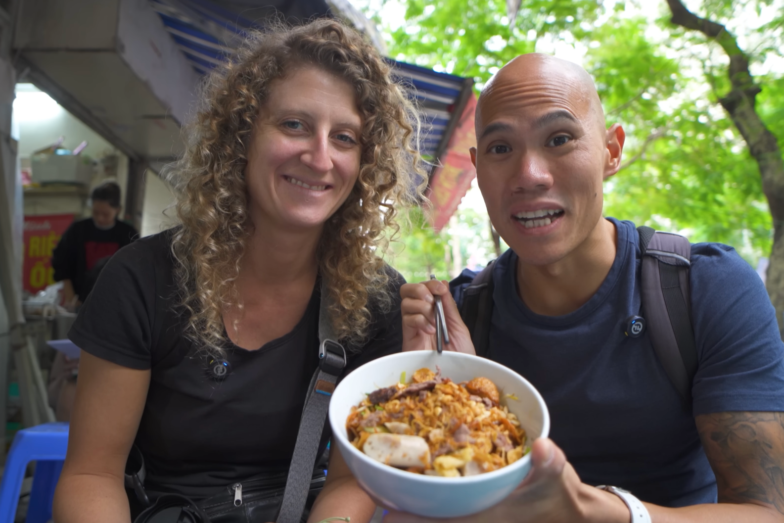 As part of their food journey, Chris and Steph sampled six iconic Hanoi noodle dishes: crab and snail noodle soup (bun rieu cua oc), stir-fried eel glass noodles (mien luon xao), chicken and egg vermicelli (bun thang), duck vermicelli (mien ngan), mixed flat rice noodles (banh da tron), and herbal black chicken noodle soup (mi ga tan). Among these, the last dish left the strongest impression.
