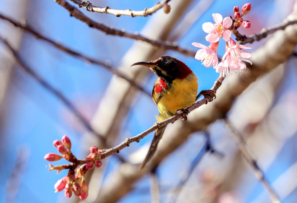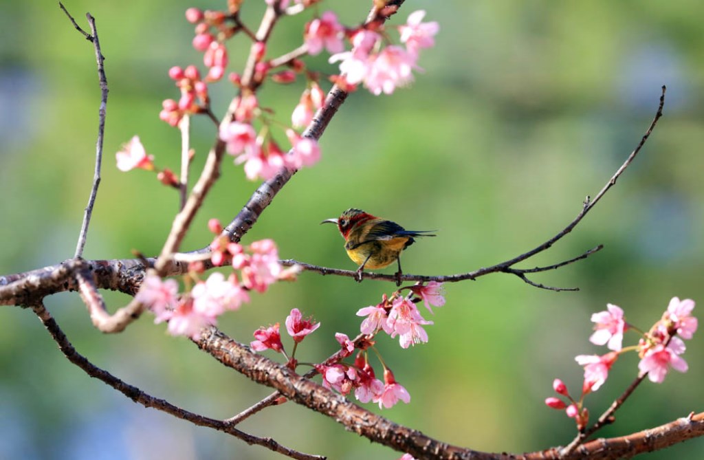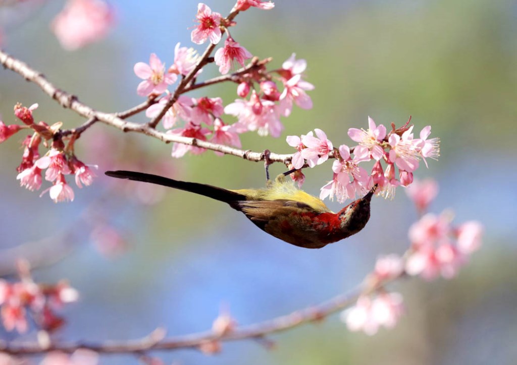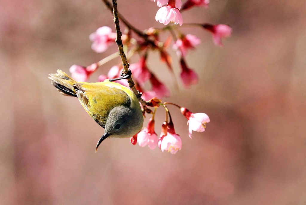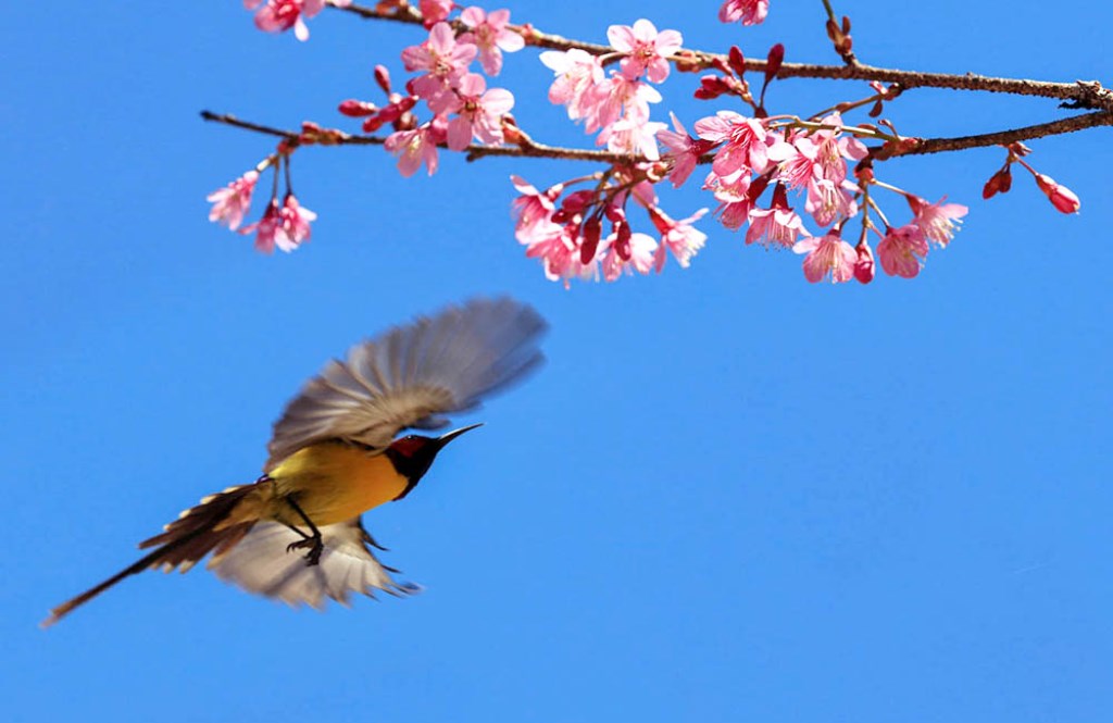 Catching photographs of the movements of birds sucking nectar from cherry-like apricot trees and playing with the flowers is an interesting experience.