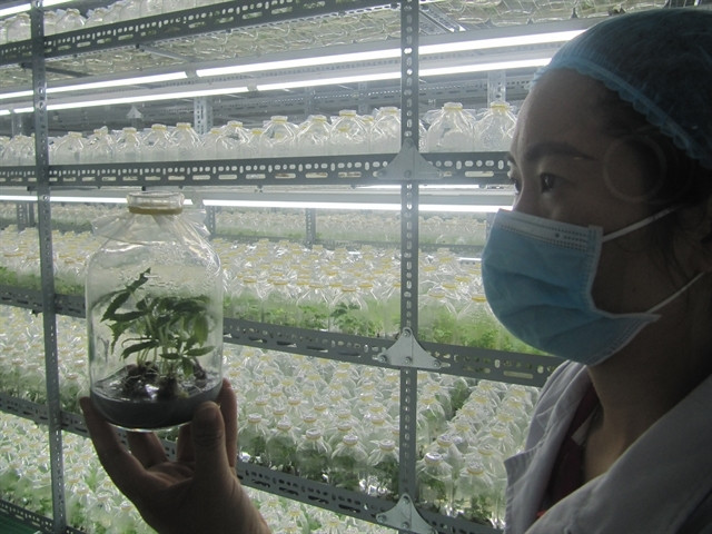 | A technician checks a bottle of ginseng saplings at a research centre of the Sâm Sâm Company in Tam Kỳ City. Quảng Nam Province plans to boost the added value of the Ngọc Linh Ginseng and investment in ginseng production projects. VNS Photo Công Thành |