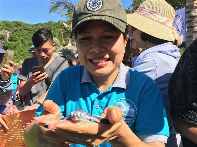 | Trần Thị Hồng Thúy, director of Chàm Islands Marine Protected Area managing board, releases a new born turtle from a turtle conservation on the Islands. Photo courtesy of Thanh Hải |