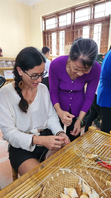 | A craftswoman guides a tourist on making a hammock using strings taken from tree bark at a tourism site on Chàm Islands. The craft has helped promote eco-tour services and the value of the traditional culture and lifestyle of the islanders. Photo courtesy of Chàm Islands Cooperative |