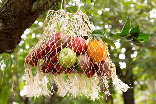 | A fruit bag made from tree bark strings. The Chàm Islands, off the coast of Hội An Town, have been promoting the use of environment-friendly products and non-plastic bags. Photo courtesy of the Hội An Essential Oil Company |
