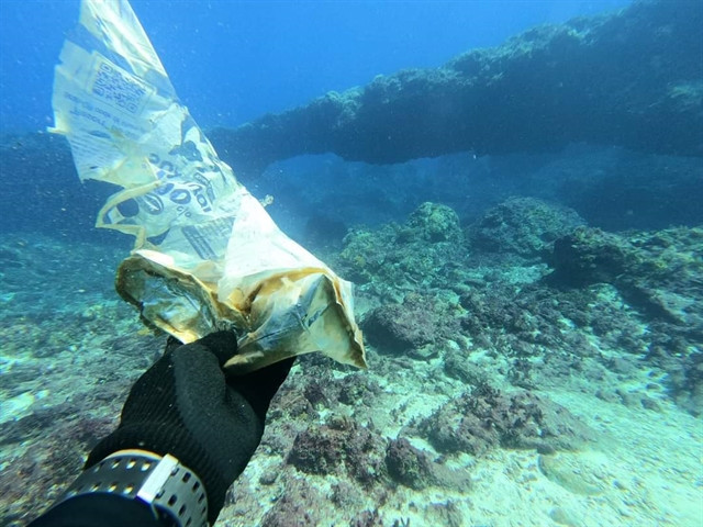 | OCEAN TRASH: Waste is collected by a diver at sea in central Việt Nam. Photo courtesy of Đào Đặng Công Trung |