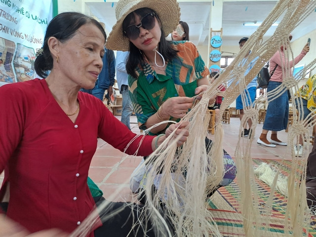 | ECO PRODUCTS: A local weaver guides a tourist in making a bark tree hammock. The islands have banned the use of single-use plastic bags for two decades. VNS Photo Công Thành |
