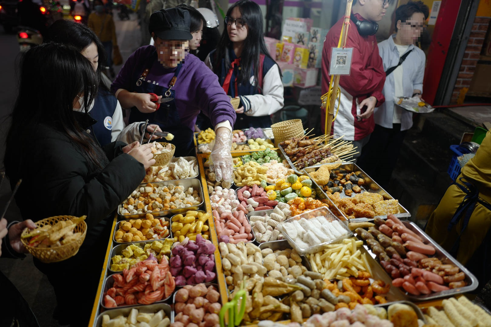 The street is known as the hub for "high-class dirty skewers" due to its bustling food scene and eye-catching displays.