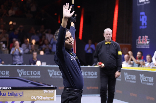 | Trần Quyết Chiến of Việt Nam celebrates his UMB Veghel World Cup Three-Cushion win, beating Frederic Caudron of Belgium in the final. Photo of UMB |