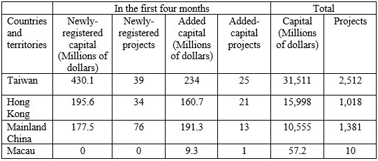 In the first four months of 2016 alone, Vietnam lured in $1.39 billion in 209 projects by Chinese investors, including $803.2 million to 149 newly-registered projects and $595.3 million in added capital to 60 existing projects. (See table below)