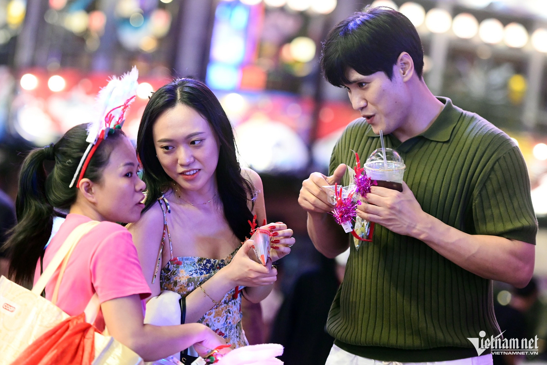 A similar scene can be observed at Bùi Viện Walking Street, a hub for many foreign visitors. The establishments here are brightly decorated to symbolize the Christmas season and attract customers.