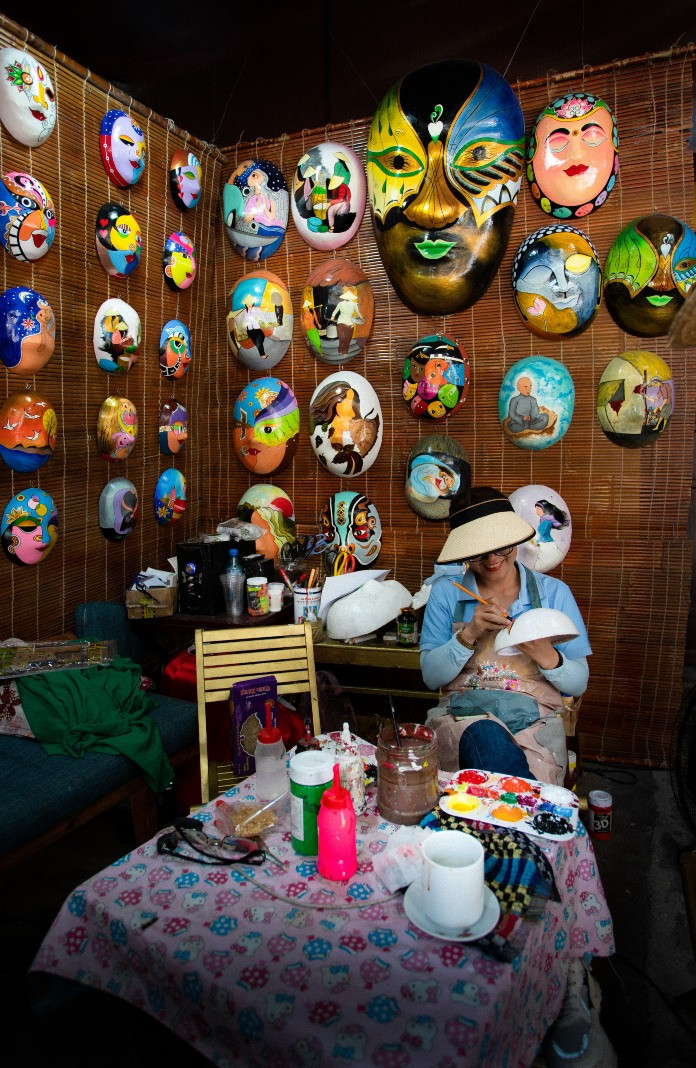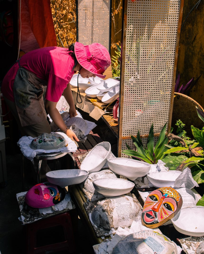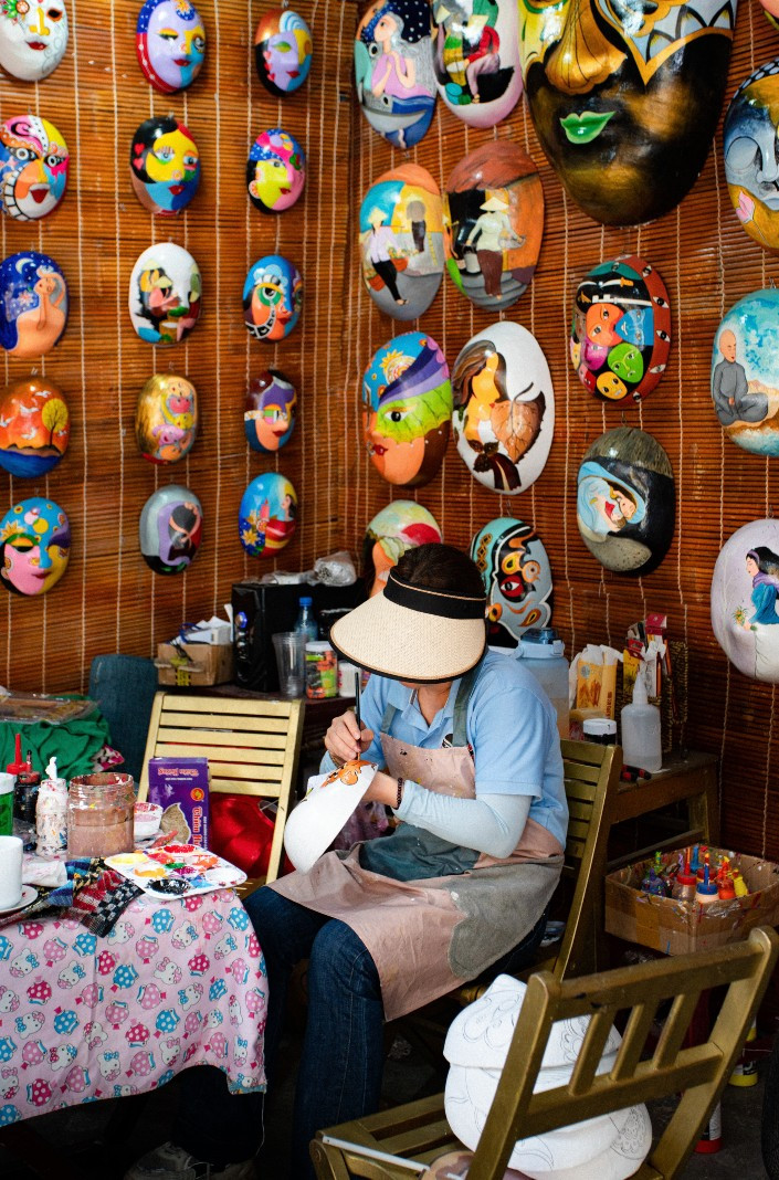 When people look at the mask, they can determine which shade it represents – good, evil, gentle or ferociousColoring is the final step in making a timing mask. The mask is the shade of the character it represents, so it requires a lot of detail and color to properly feature that shade.Making a timing mask needs various stepsA mask is made of waste papers bonded by a special powder glueThe craftsperson colors the mask. Being colorful and with many details featuring the character’s shade are the highlights of the timing mask.The craftsperson colors the mask. Being colorful and with many details featuring the character’s shade are the highlights of the timing mask.Surface sanding is an important step to shape details such as the nose, lips, eyes and cheekbones. This step requires patience and experience.The artisan’s workspace is surrounded by various masksAfter wrapping the papers, the worker dries the masks in the sun. Depending on the intensity of sunlight, this step can last two to three days.The mask is often used at tuồng cổ (classical Vietnamese opera), featuring different characters such as generals, fairies or good and evil people