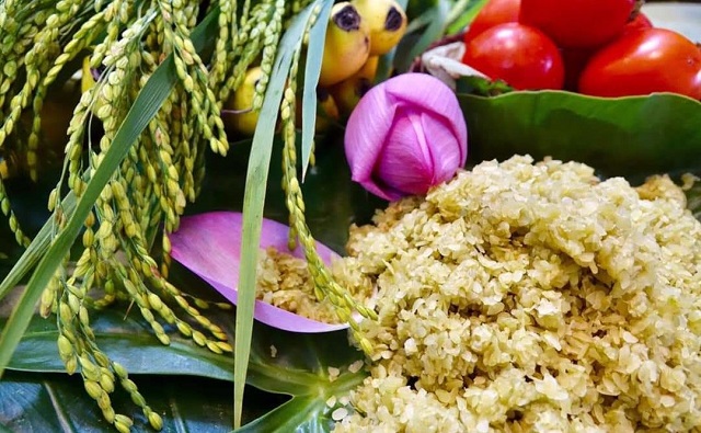 Com lang Vong was made of young glutinous rice when it is about to ripen, that still contains the rice milk inside and is fragrant.