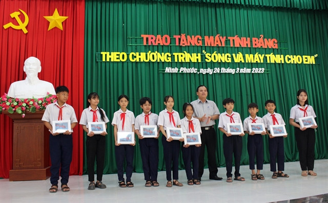 Giving tablets to outstanding students in Ninh Phước District, the southern province of Ninh Thuận. |
