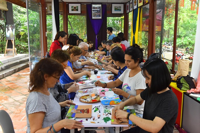 Visitors trying their hands at making paintings from fabric scraps during their excursion to Van Phuc Silk Village (Photo credit: Nha Khanh)