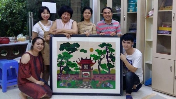 Painter Dang Thi Khue (standing, second from left) and Vun Art members posing with a fabric-collaged painting featuring Hanoi’s Temple of Literature (Photo: phunuvietnam.vn)
