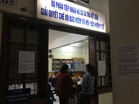 People wait in front of social insurance agency in Ba Dinh District to register for a voluntary health card. The number of people who buy insurance increases as the pandemic of COVID-19 spreads