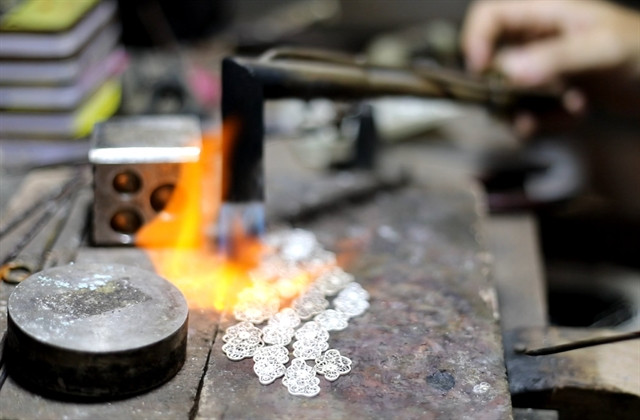 A silversmith must constantly adjust the heat to ensure a perfect bond between the silver threads. VNS Photo Đoàn Tùng. |